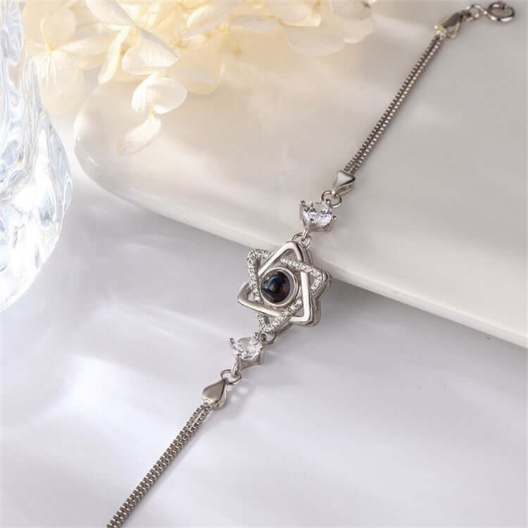 احمل ذكرى عزيزة معك أينما ذهبت مع سوار فيليسيتي ذو النجوم الستة المدببة. تصميم النجمة المعقد يحمل صورة بالداخل، مما يضيف لمسة شخصية إلى هذه القطعة الأنيقة. هدية جميلة لنفسك أو لأحد أحبائك.