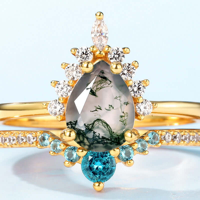 洋ナシの形をした苔瑪瑙石とダイヤモンドリング