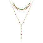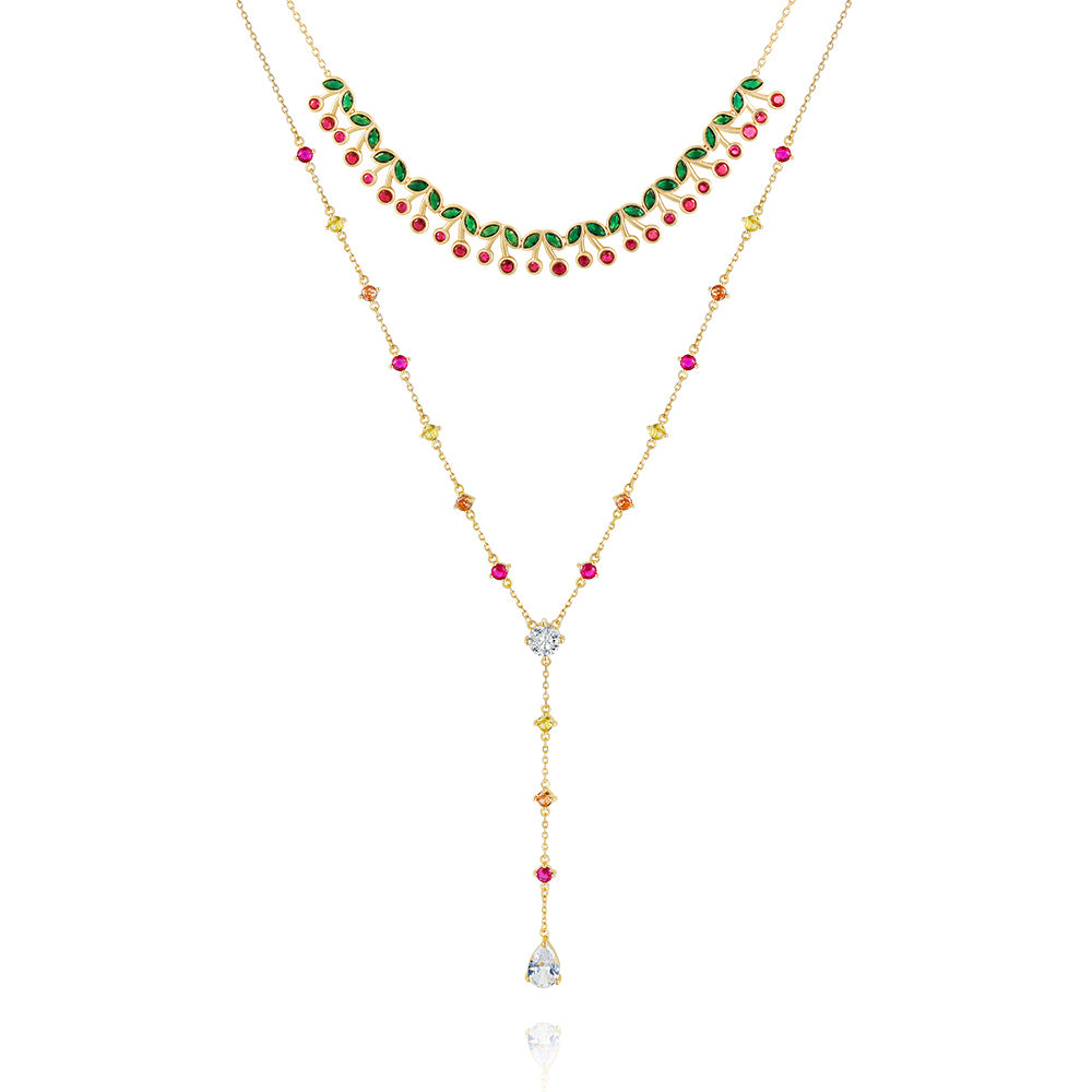 A stunning necklace inspired by the natural beauty of ripe cherries, featuring delicate ruby-hued gemstones and glossy green leaf-shaped accents, paired with luxurious gold-plated details. Perfect for layering or wearing solo, it adds a playful yet sophisticated vibe to your outfit.