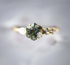 Introducing our exquisite Moss Agate engagement ring, featuring a distinctive asymmetrical design that ensures it stands out elegantly. Adorned with a pear-shaped Diamond accent stones, this ring showcases the unparalleled beauty of Moss Agate in a truly captivating manner.