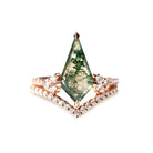 Highlighting the uniqueness of Moss Agate is none other than a dazzling set of White Diamonds. Our V-shaped band guarantees the distinctive kite-shaped center stone stands out effortlessly.