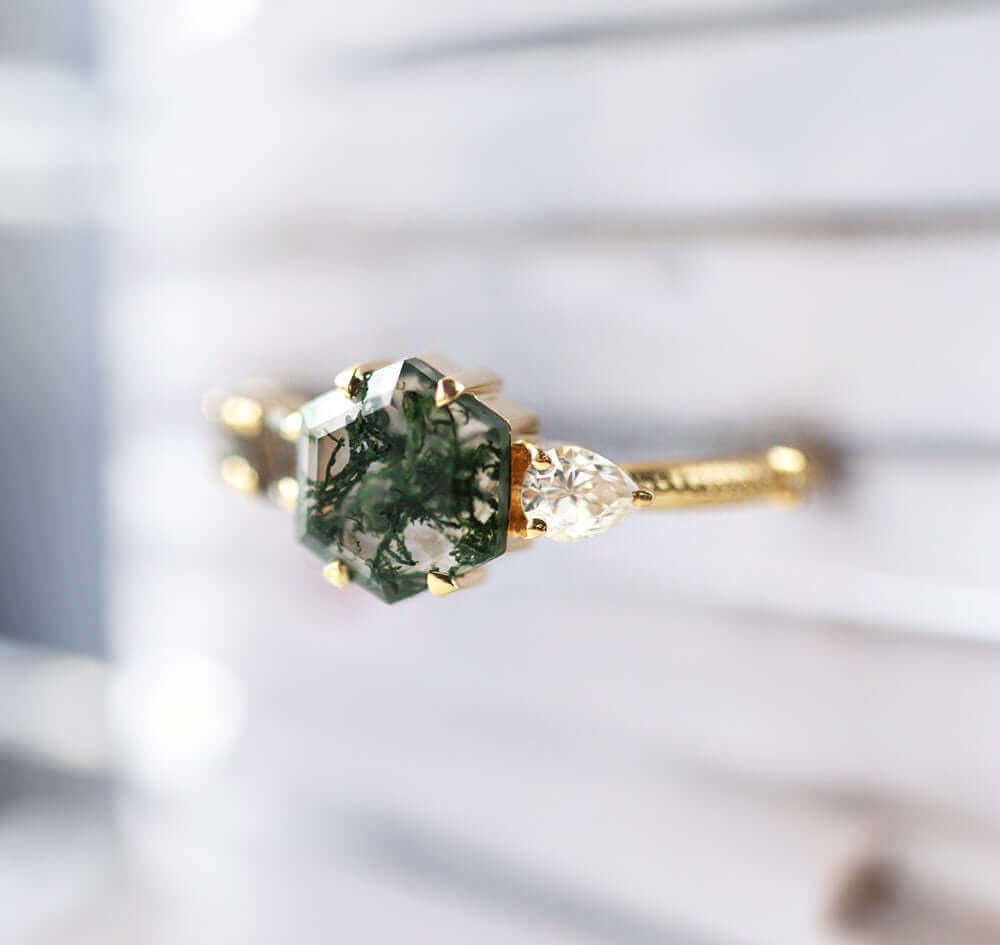Introducing our exquisite Moss Agate engagement ring, featuring a distinctive asymmetrical design that ensures it stands out elegantly. Adorned with a pear-shaped Diamond accent stones, this ring showcases the unparalleled beauty of Moss Agate in a truly captivating manner.