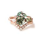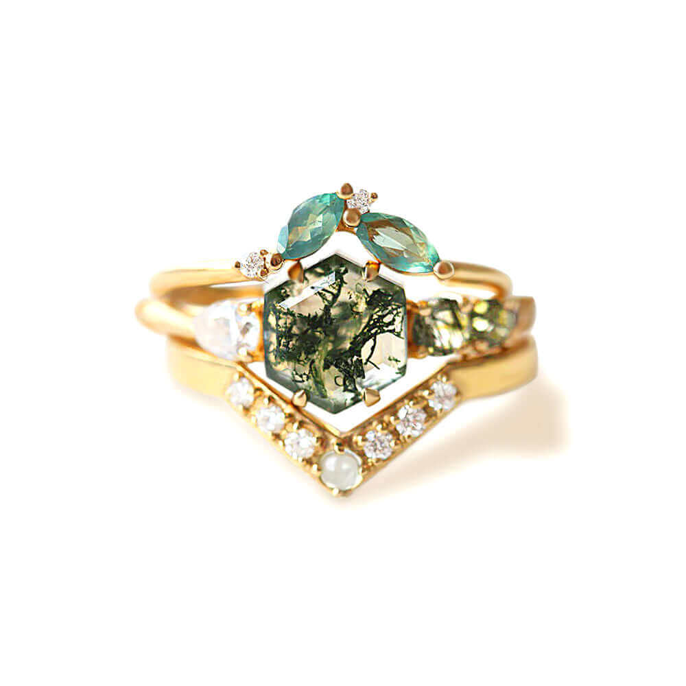 Trendolla 14K Gold Polygon Leaf Moss Agate And CZ Diamond Ring Set